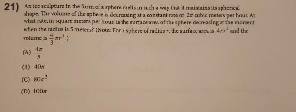 Solved 21 An Ice Sculpture In The Form Of A Sphere Melts In Chegg Com